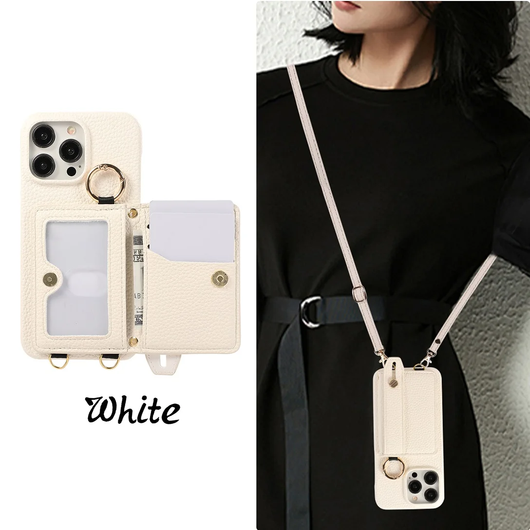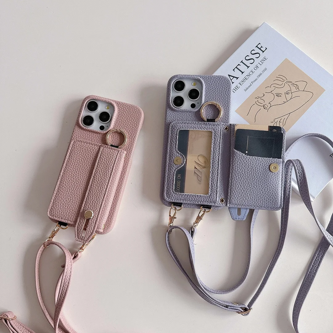 Luxury Shoulder Leather Card Pocket Wallet Case For iPhone 11 12 13 14 15 16 17 Pro Max Plus Purse Phone Cover Wrist Strap Stand